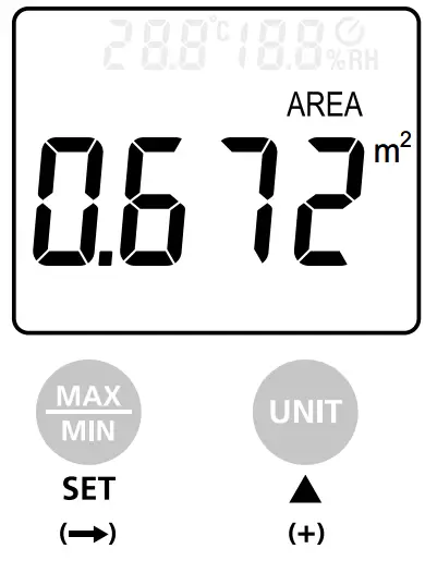 After switching on by pressing the „MODE“ button, activate the function for measuring volumetric flow until „AREA“ appears on the display. The first number begins to flash. Use the „5“ (+) and „SET“ (change decimal place) buttons to enter the determined area. The area can be set both in square metres (m²) as well as in square feet (ft²). The end of the input is signalled by a double beep.