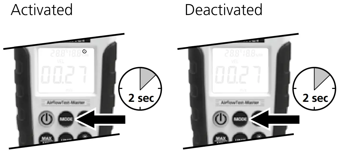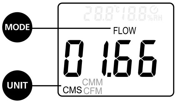 Activate the „FLOW“ function by pressing the „MODE“ button. After selecting the corresponding unit – CMM (cubic metres per minute), CFM (cubic feet per minute) and CMS (cubic metres per second) – press the „UNIT“ button to determine the volumetric flow based on the set area.