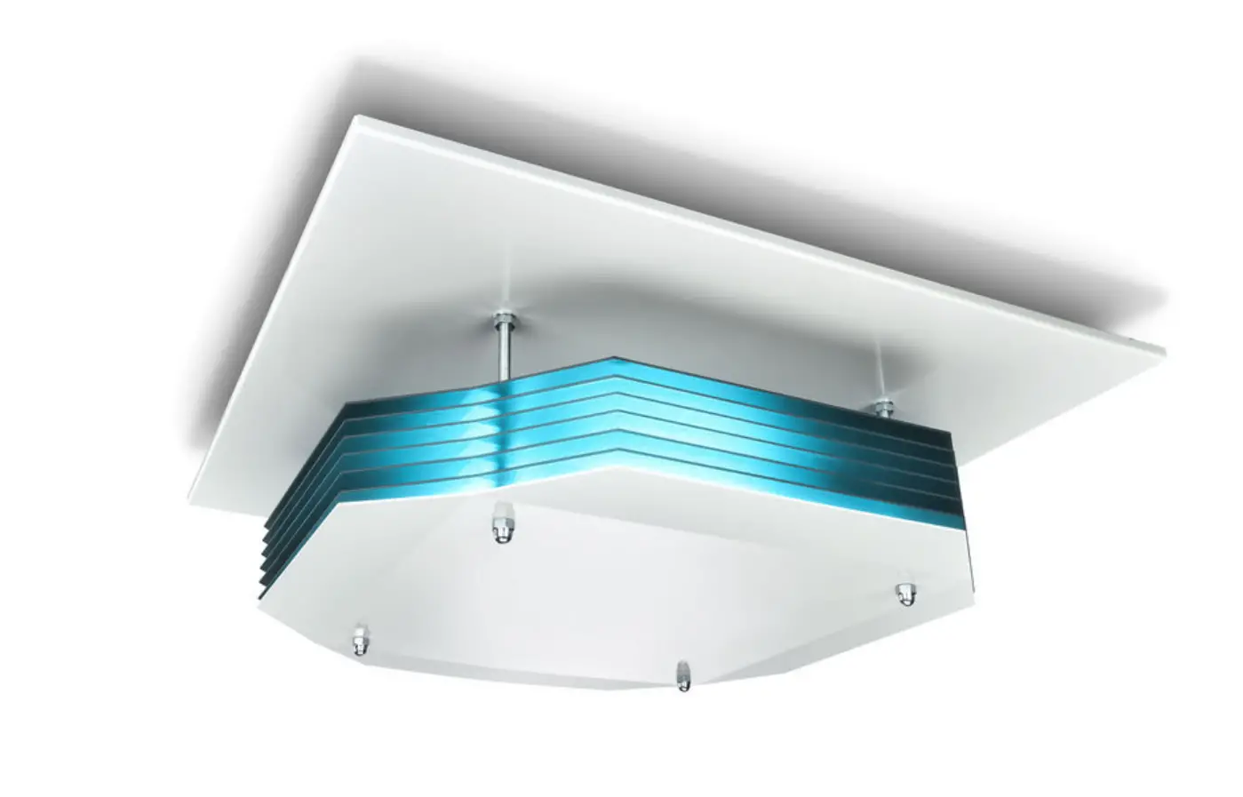 Philips UV-C disinfection upper air ceiling mounted is designed to be installed on false ceilings for the disinfection of air in a wide range of applications. Optimized for low ceiling heights, the UV-C rays are distributed at device level and above. The beam of UV-C rays is controlled by specific reflectors and the louvre design. This allows for the disinfection of the air in a space, while ensuring that day-to-day business activities can continue underneath the area where the device is active.
