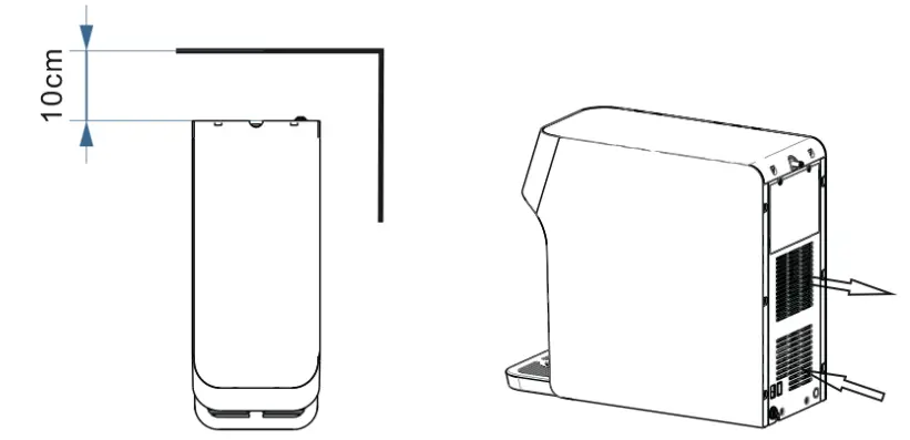 - Filter should be cleaned for first time usage. Turn on the faucet to flush the filter for 10 minutes. When installing the machine, please ensure that there is a 10 cm gap between the rear of the water dispenser and the wall so that there is proper airflow for the air inlet and outlet.