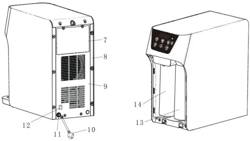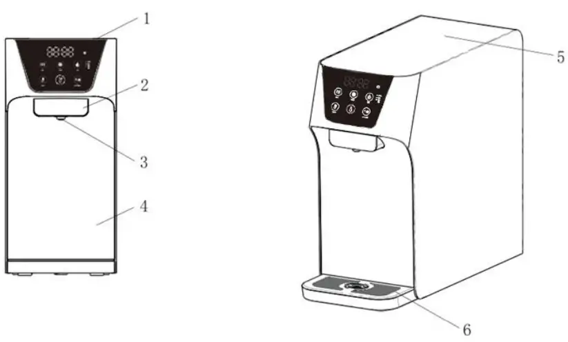 , all other button can be active only after you execute hot water dispensing 10S). - Hot and Cold water inlet