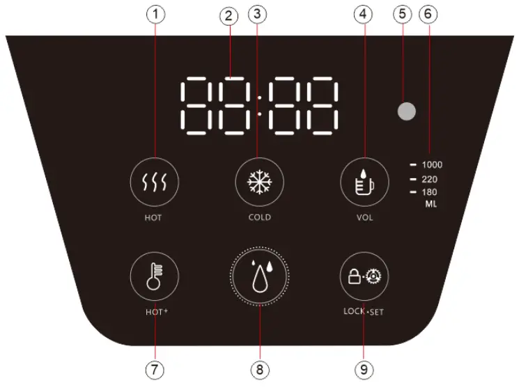 – Hot water dispensing button: Red and White light; used to start the hot water dispensing and setting mode plus “+” button.