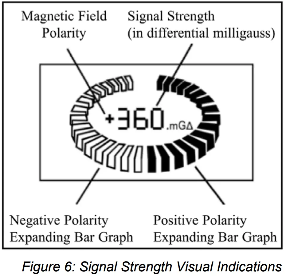 Signal Strength and Polarity Indicator: The signal strength, defined as the difference (or delta Δ) between the magnetic field detected at the top and bottom sensors, is shown as a numerical indication in mG (milligauss) units, is preceded by the polarity of the signal (+ or -), and is followed by the Δ symbol (to emphasize that it represents a “difference” between the two ends of the sensor array).