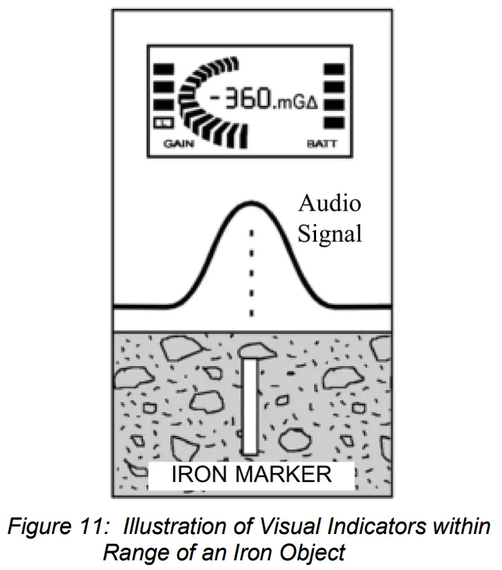 NOTE: The number of bars shown in the bar graph, the number displayed in the digital readout, and the frequency of the audio signal will all depend on the signal strength, which is affected by the type of iron object detected, its orientation, and the gain setting.