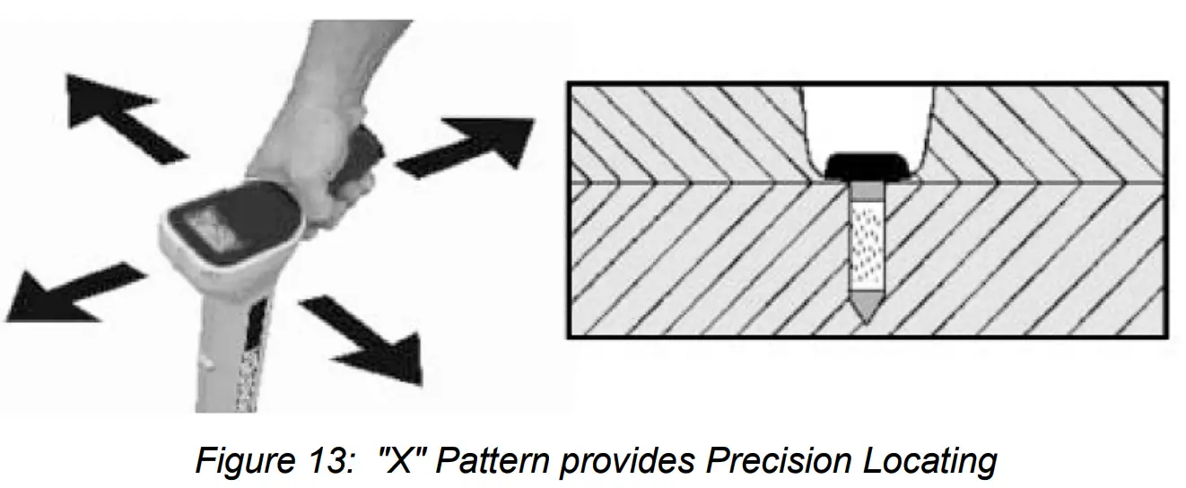 After you have detected the presence of a target, hold the locator vertically and slowly move it back and forth in an “X” pattern while listening to the audio response and observing the bar graph indicator. For a given gain setting, the number of bars will be greatest when the locator is directly over a vertical target or the ends of a horizontal target. The “X” pattern, as shown in Figure 13, is ideal for pinpointing small objects. A 1-1/4 inch PK nail buried up to 10 inches can be located precisely using this technique.