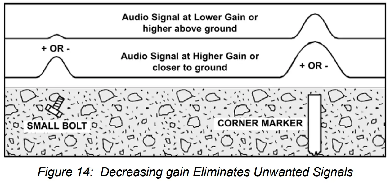 If you are looking for a corner marker and detect two or three signals in the same general vicinity, raise the locator several inches above the ground or decrease the gain setting. Any signal that disappears when the locator is held higher or when the gain is decreased is likely coming from a smaller target. The signal from a rusty bolt or other small item (see Figure 14) is much weaker than the signal from a larger target, such as an 18-inch length of 3/4 inch rebar which can be located at depths up to 8 feet.