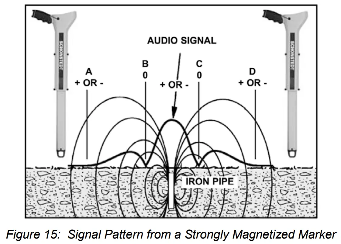 A strongly magnetized marker that is at or near the surface will provide a weaker indication on both sides of the marker, and that could be mistaken for the marker.