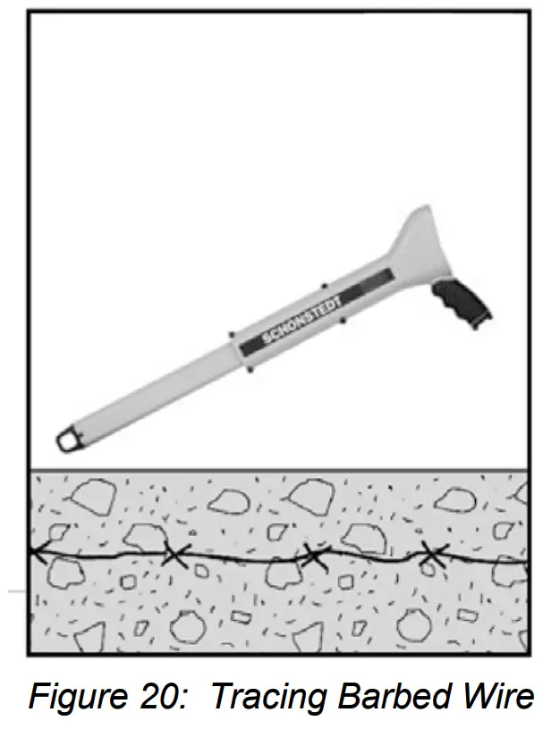 You can often trace barbed wire (from old fence lines) buried just beneath the surface. Even if the wire is only a trail of rust, it can still be detected near the surface. Tip the locator a little lower than usual – but not parallel with the ground.