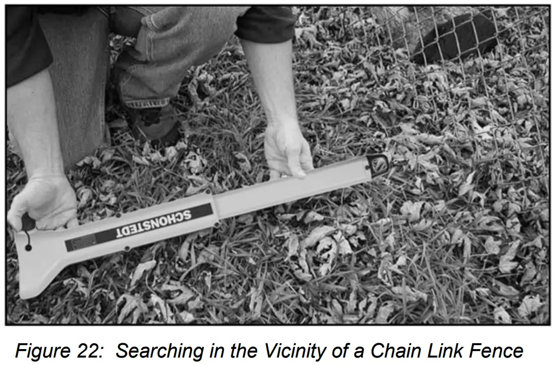Searching in the vicinity of a chain link fence requires a reduced sensitivity setting and some control over the orientation of the locator. As illustrated in Figure 22, position the locator horizontally with its long axis perpendicular to the fence. This insures that the upper sensor is kept away from the fence.