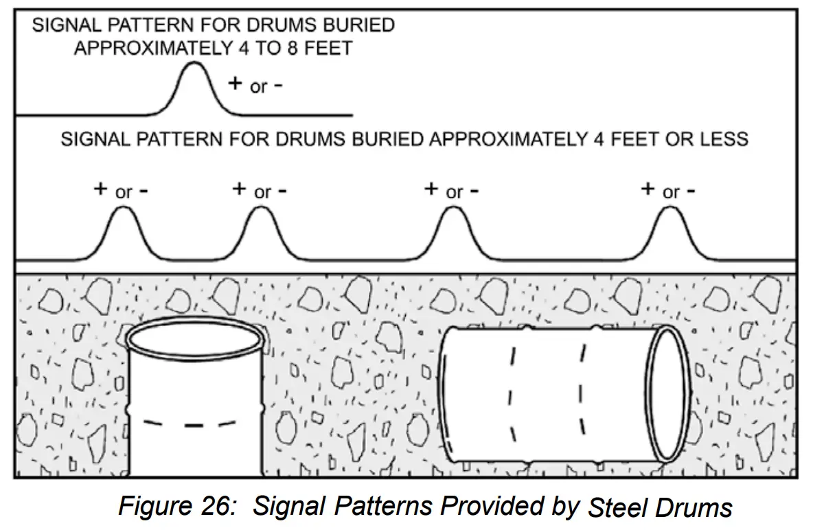 As shown in Figure 26, the GA-92XTd’s signal pattern will vary depending on the vertical or horizontal orientation of the drum and how deep it is buried.
