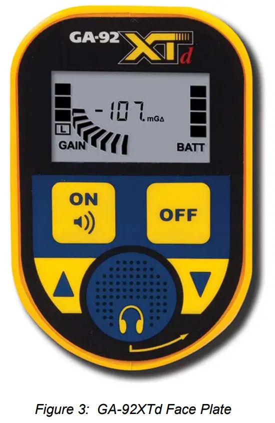 The GA-92XTd magnetic locator detects the magnetic field of ferromagnetic objects. It responds to the difference in the magnetic field between two sensors that are spaced approximately 9.5 inches apart. This difference is referred to as the “signal strength” throughout this manual and is represented in the instrument by an audio tone, the display of a bar graph, and a numeric indication. In addition, the polarity of the signal strength is shown as a + or sign on the display, and determines the side (right or left) on which the bar graph is displayed. Although most objects can be located using the audio indication alone, simultaneous use of the audio and visual responses will provide additional information to help you pinpoint a target and determine its orientation.