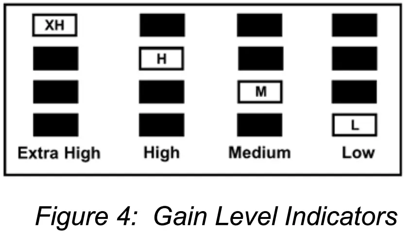 Gain Level Indicator: The gain range is indicated by a 4-segment LCD as shown in Figure 4: L (Low), M (Medium), H (High) and XH (Extra High). Upon turn on, the gain defaults to M (Medium). Each press of the UP or DOWN arrow buttons will cause the gain level indicator to change accordingly.