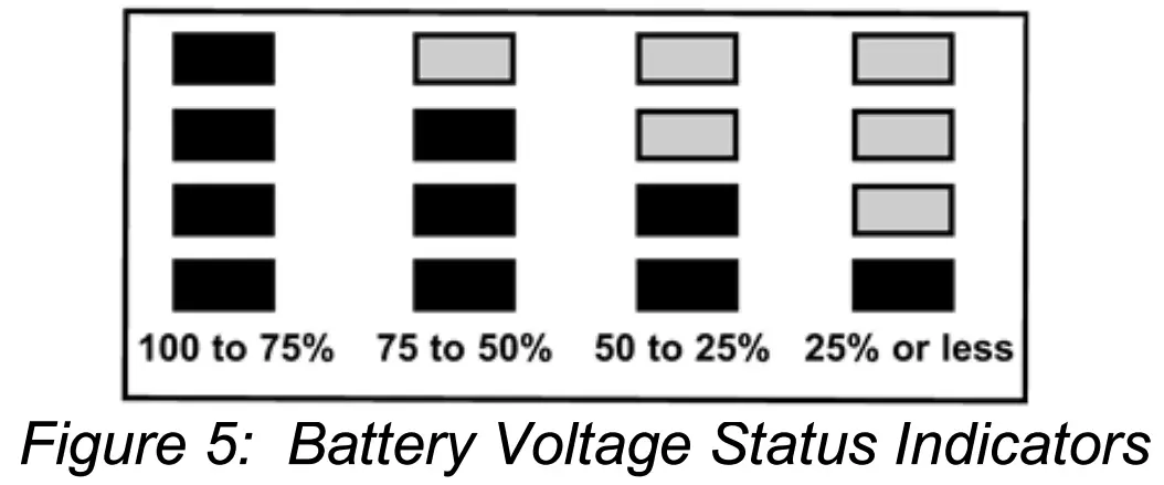 Battery Level Indicator: The battery level is indicated by a 4-segment LCD indicator, as shown in Figure 5. When all four segments are black, the voltage level is between 100% and 75%. As the voltage decreases, the number of black segments decreases. Battery life varies with usage and the ambient temperature. Cold temperatures reduce battery life. Low temperatures may result in only two or three segments being black. This could be temporary, and all segments will change to black as the temperature increases.