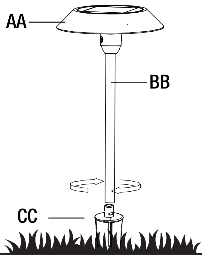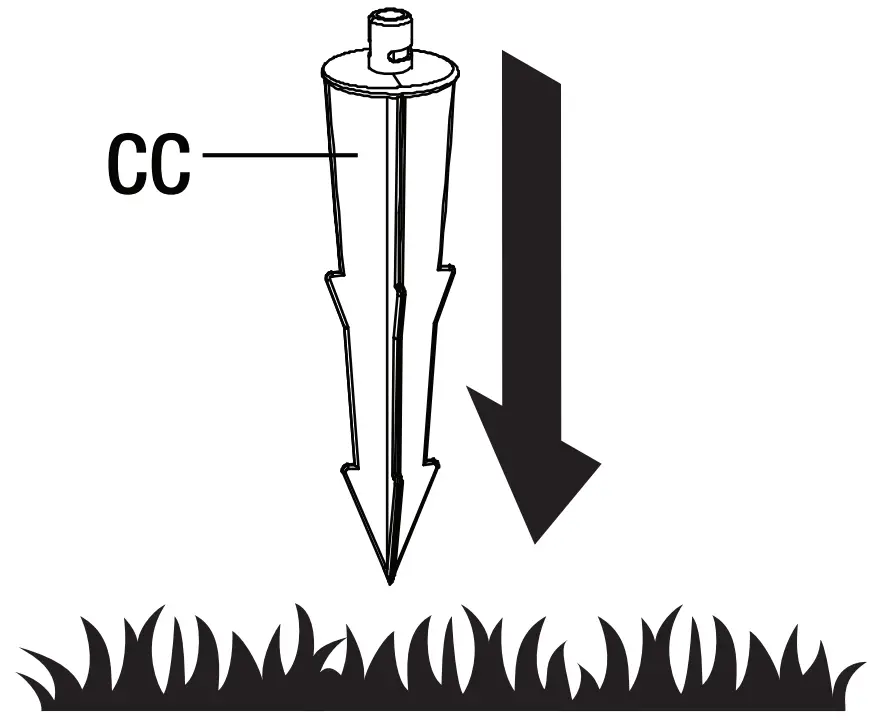 - Push the ground stake (CC) into the ground. Using rubber mallet, insert ground stake (CC) deep enough into the ground to ensure fully assembled pathway light (AA) is stable and does not tip over.