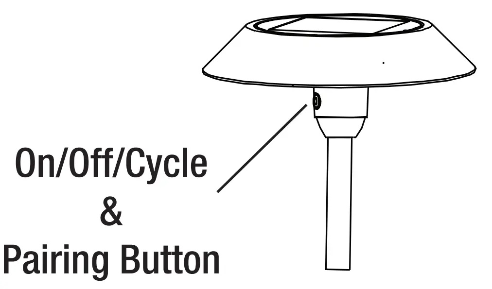 - After the unit has charged in the sun for two (2) days, turn it back on by pressing the On/Off/Cycle button and selecting the color of your choice. If there is daylight outside, it will stay on for about 10 – 20 seconds and then turn off. If it is nighttime, the unit will remain on.