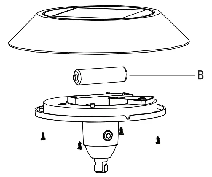 - To replace the rechargeable battery (B), unscrew the lid screws (4) located under the light using a Phillips head screwdriver.