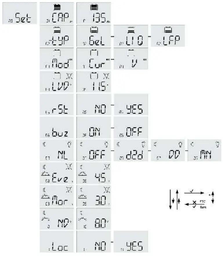 - LVD menu: LVD: 11.0 V … 11.5 V (default 11.0 V) / SOC: 11.5 V … 12.0 V (default 11.9 V) (Only Battery Type: Gel / Liquid)