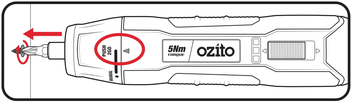 In Push 2 Go mode, the screwdriver will only start when it is pushed against a screw head.