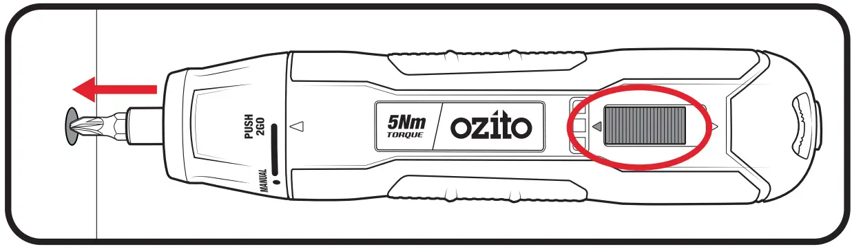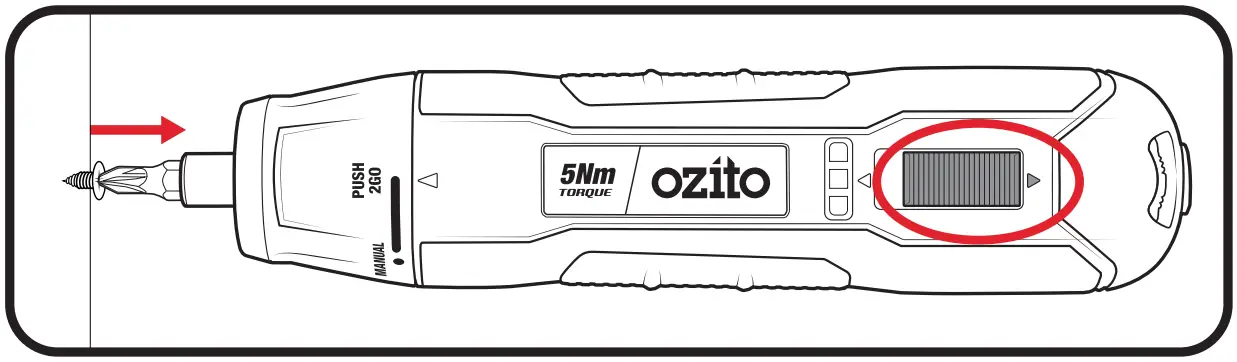 - In Manual mode, push the switch forwards to tighten screws.