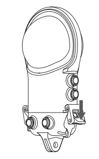 Lift the buckle as shown below ( ), then pull it down to remove from the hook ( ). Repeat with the other buckle. When both sides are disengaged, open the Dive Case.