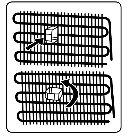 - Install the plastic distance guide (the part with black vanes at the rear) by turning it 90° (as shown in the figure) to prevent the condenser from touching the wall.