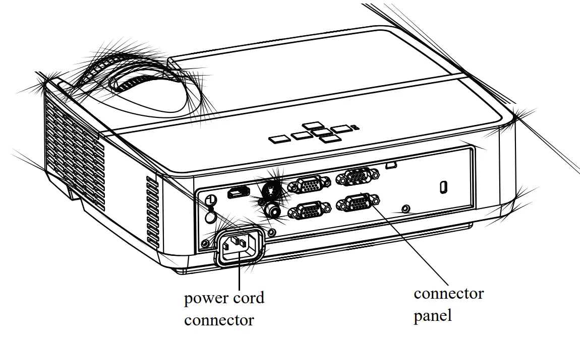 - Do not spill liquid on the projector. The spilled liquid may damage the projector. Use the power cord provided. Connect the power cord to a receptacle with a protective safety (earth) ground terminal. A surge-protected power strip is recommended.