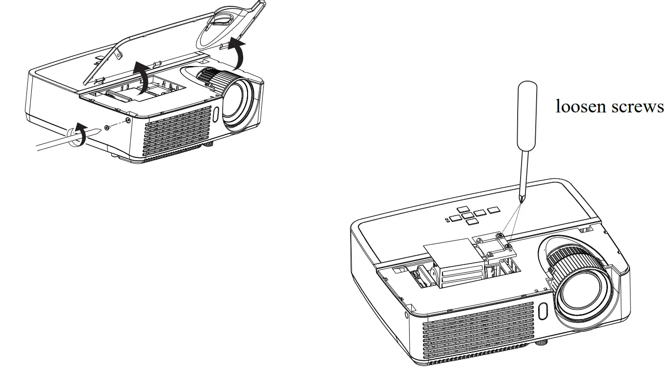 - When the projector is ceiling mounted, wear protective eyewear to prevent eye injury before opening lamp door.