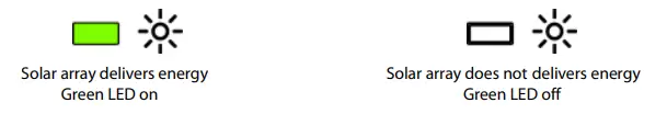 | Battery is not being charged during the day | ![]() | Solar array faulty or reversed polarity (Green LED off) | Remove faulty connection / reversed polarity |