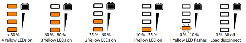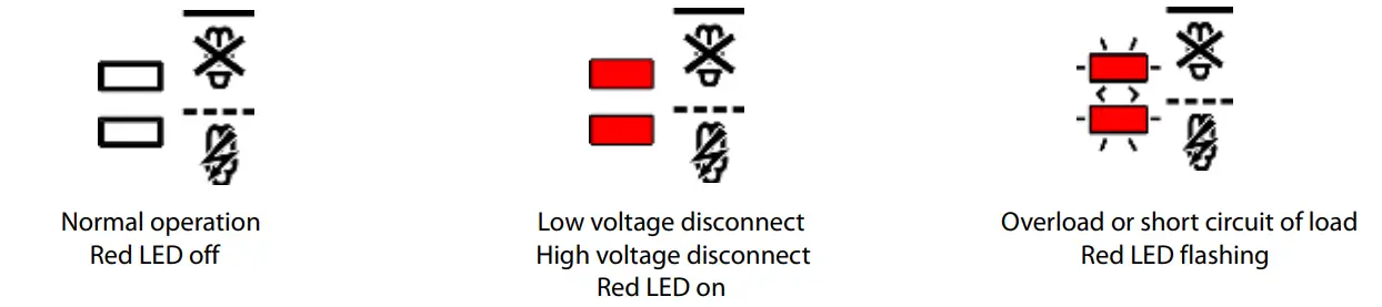 In case of deep discharge or overload/short circuit of load, the load output is switched off. This is indicated by: