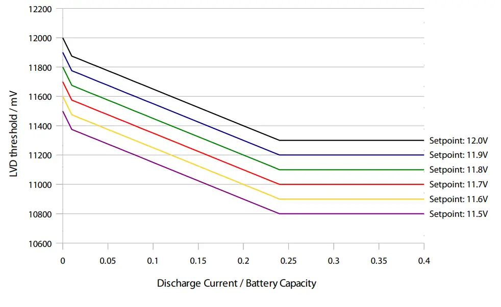 Mode 1 LVD Current Adapted (SOC): Load disconnect level at no discharge current can be set between 11.5/23.0/46.0 V and 12.0/24.0/48.0 V. The disconnect voltage depends on the voltage, discharge current and battery capacity. At nominal discharge current (0,1 C/h) : 11.15/22.3/44.6 V to 11.65/23.3/46.6 V Battery capacity : 10Ah-5000Ah