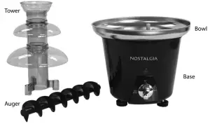 Your CHOCOLATE FONDUE FOUNTAIN requires little assembly. Prior to use, wipe out Bowl with a damp cloth and dry. Wash Auger and Tower in warm soapy water, rinse, then dry.