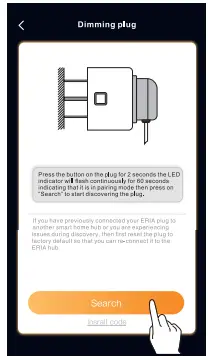 9. Proceed by pressing on “Search” to allow the Adurosmart ERIA hub to find the plug, the LED indicator on the hub will flash green this indicates that the hub is searching for new devices.