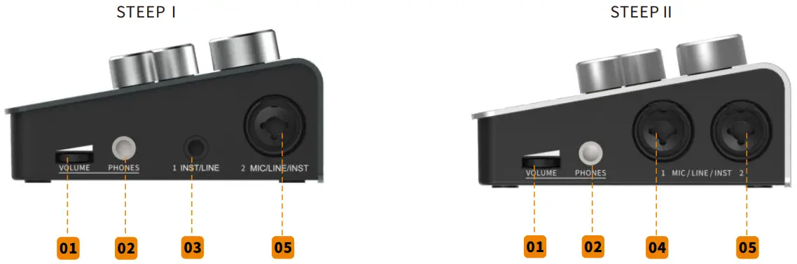 48V phantom power switch for microphone input (input 2 of STEEP I, input 1 and 2 of STEEP II). When it is on, a condenser microphone can be powered by phantom power. For other microphones, please turn off the phantom power or refer to the recommendations from the microphone manufacturer.