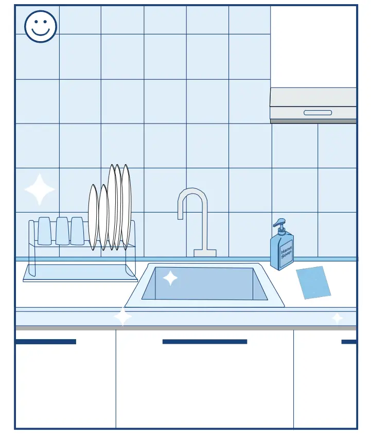 Recommended practices when taking care of your IKEA kitchen: Avoid splashing water over your kitchen cabinets and cabinet fronts. If exposed to moisture, wipe dry after every use with soft absorbent cloth to avoid damage. Be especially mindful of the area around the sink. Wipe the area dry after each time you wash the dishes. Place your washed dishes in a dish drainer or dish drying mat.