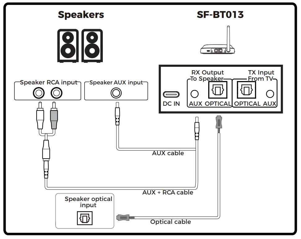 Switch Wireless Audio Adaptor SF-BT013 to RX mode, “RX” will be shown on the screen;