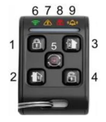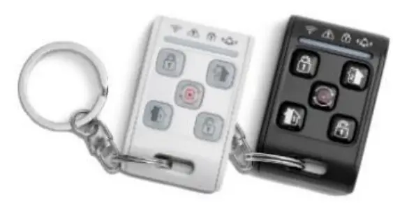 The RMC has an elegant design and is supplied with a keychain. The key fob is battery operated and it alerts on low battery conditions. For enrollment information, see the alarm system’s Installation guide; for using instructions, see the alarm system’s User guide