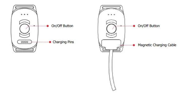 Place the magnetic charging cable against the charging pins to charge. See the picture below.