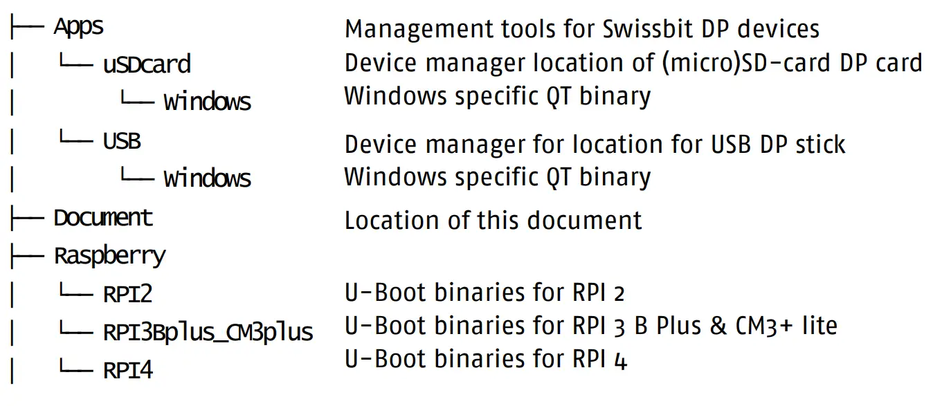 The Swissbit Secure Boot for Raspberry Pi solution provides an SDK with U-Boot binaries and configuration files for Raspberry 2, 3 and 4 boards, and managing applications tools to configure a Swissbit DP products. Prebuilt UBoot binaries are available for Raspberry Pi 2, 3 and 4 boards, configuration tools for Microsoft Windows (Windows 7 and higher). This chapter describes where to find the particular components. The Swissbit Secure Boot SDK is packed in the file Swissbit_SecureBoot_SDK_RPi.zip. After unpacking in a directory, the SDK has the following directory structure: