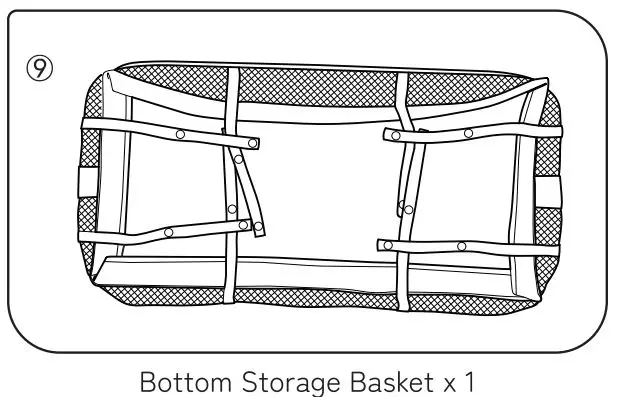 A) Attach the Bottom Storage Basket with 8 snap fasteners.