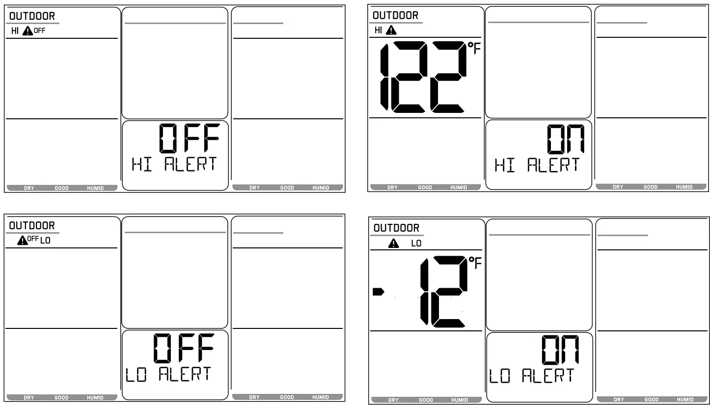 - Hold the ALERTS button to enter alert set mode. Outdoor HI ALERT OFF will show. If you wish to set this alert value, press the + or – buttons to arm this alert (ON).