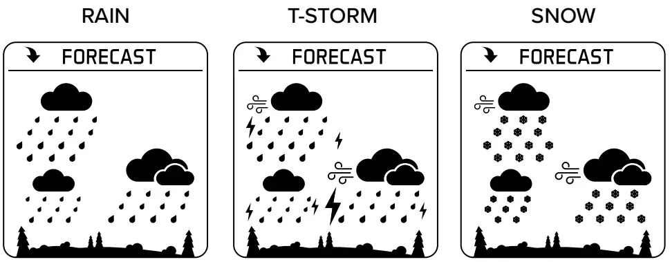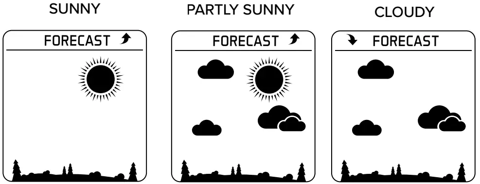 Six forecast icons use changing atmospheric pressure to predict weather conditions for the next 12-hours with 70-75% accuracy