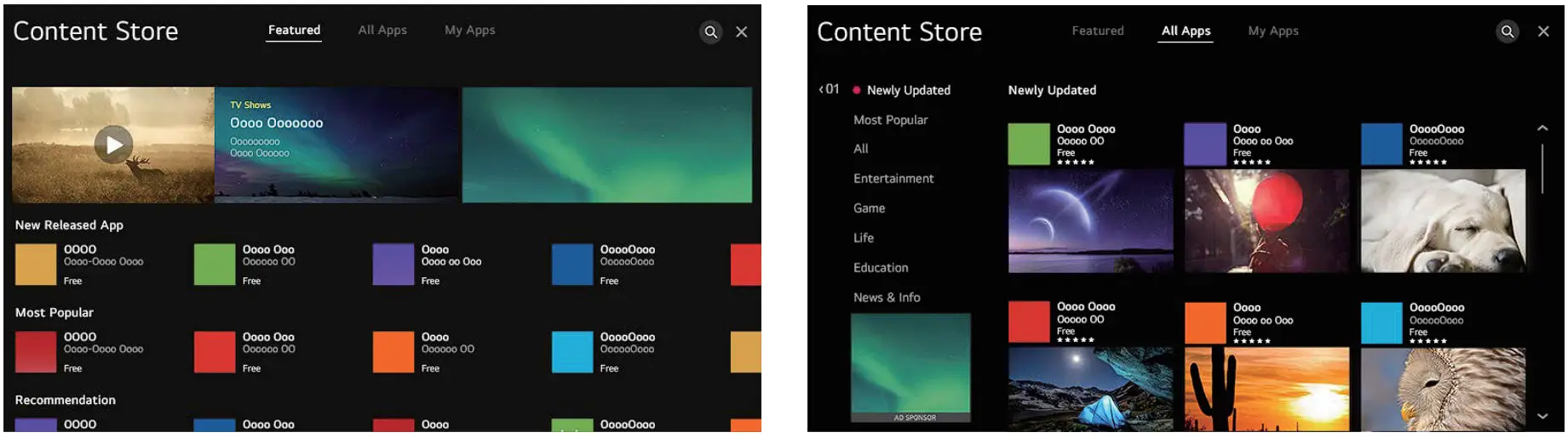 You can run, move, and delete the apps installed on your TV. Focus on each App area. It provides the Preview at the top. You can check or run useful features of each app and recommended content on the Preview without entering into the app. - Web Browser
