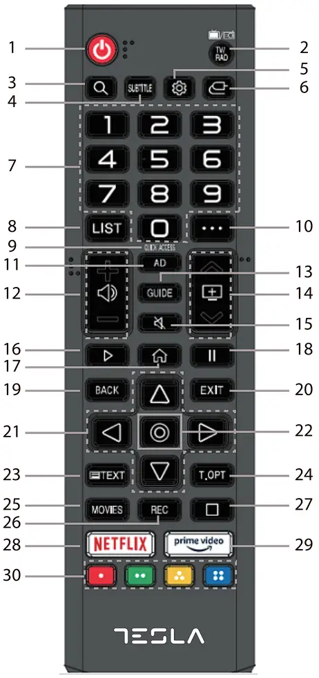 : Power, press to enter or exit standby mode.- TV/RAD: Switch to TV or Radio.