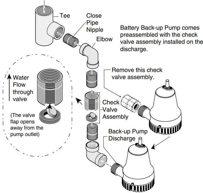 NOTICE: There must be a check valve installed in the Primary Sump Pump discharge pipe between the tee and the Primary Sump Pump. This will prevent recirculation into the Primary Pump when the Backup Sump Pump comes on. - The backup pump (Key No. 6) and check valve assembly (Key Nos. 4 and 5) come preassembled. Thread the close pipe nipple into the check valve.
