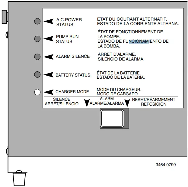 of the ‘AC Power Status’, ‘Pump Run Status’, or ‘Alarm Silence’ LEDs and with the ‘Charger Mode’ LED flashing alternately YELLOW/GREEN |