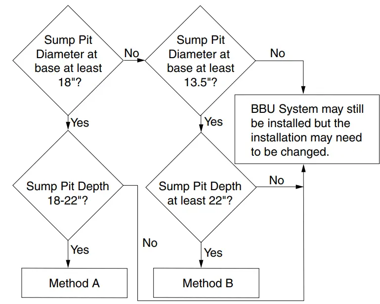 There are two ways to install the Battery Back-up Pump. Method A and Method B. See Figure 3 to determine which method to use. Both methods are acceptable.