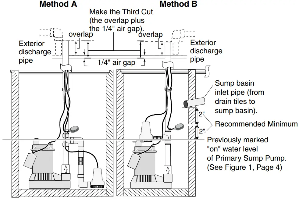 - Locate the “on” water level of the primary sump pump. Mark this location on the discharge pipe with a pencil. See Figure 1.
