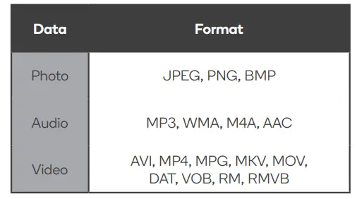 USB Media Playback Formats: JPG, JPEG, PNG, BMP, MPO, GIF, MP3, WMA, M4A, AAC, MPEG, MPEG4, H.265, VP9 (4K@60P)