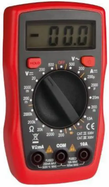 This device is a battery-operated, hand-held 3 ½ digital multi-meter for measuring DC and AC voltages, DC current and resistance. It also offers the possibility of executing continuity tests and of testing diodes and transistors. The back light is optional.