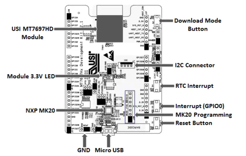 - USI MT7697HD module with on-board printed antenna , support 802.11a/b/g/n and BLE 4.2